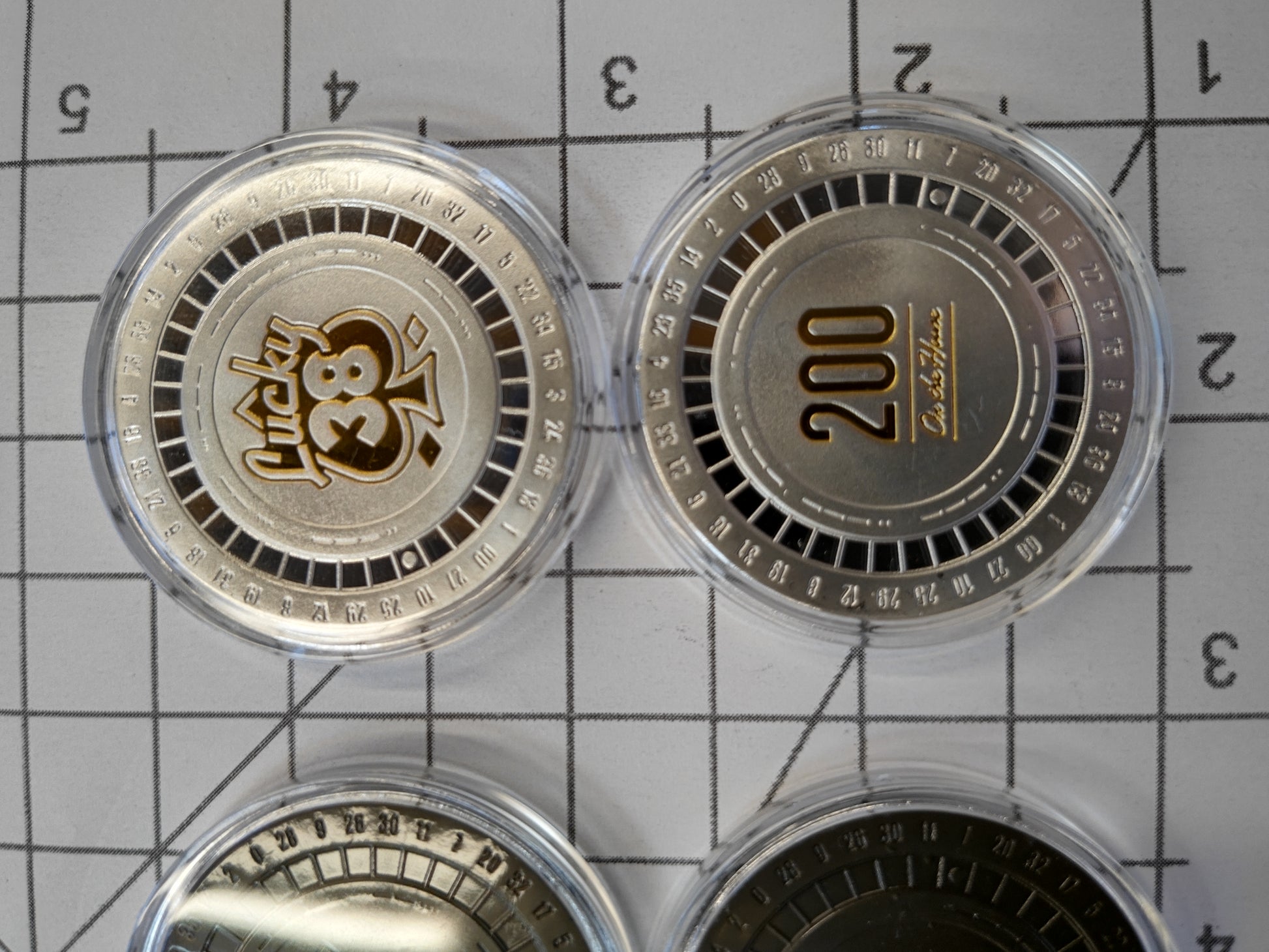 Set of Lucky 38 coins, encapsulated but can be easily opened, head features "LUCKY 38", tail features "200 ON THE HOUSE". Coated nickel, centre gold area may appear darker than the phono without light.